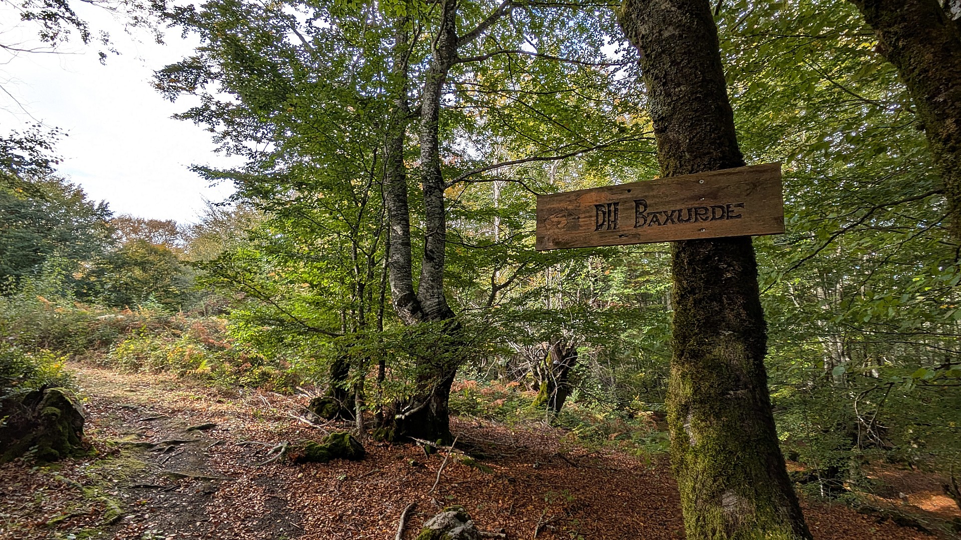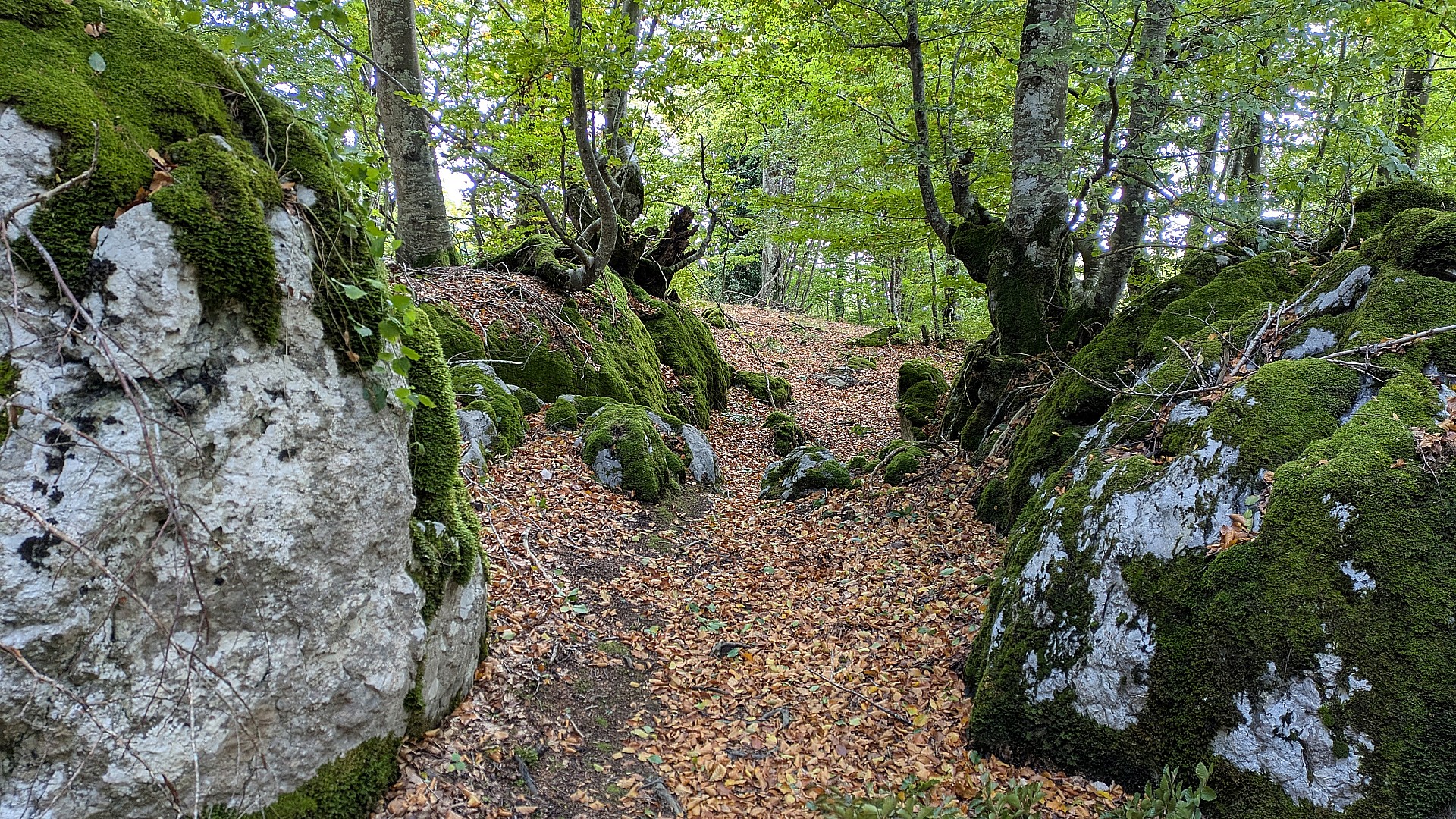 Sentier en forêt avec des passages entre des blocs lisses et moussus
