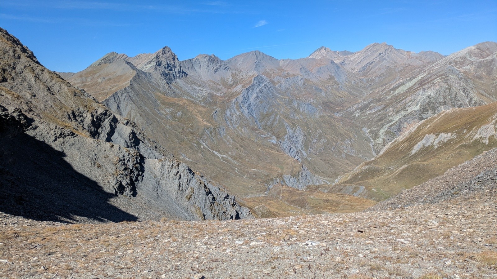 Je prends 10' pour faire le point et je file en direction du Monte Faraut et sa traversée mal commode sous Buc Faraut. Je laisse le vélo 50m sous le sommet au niveau de la zone des lauzes bien acérées.