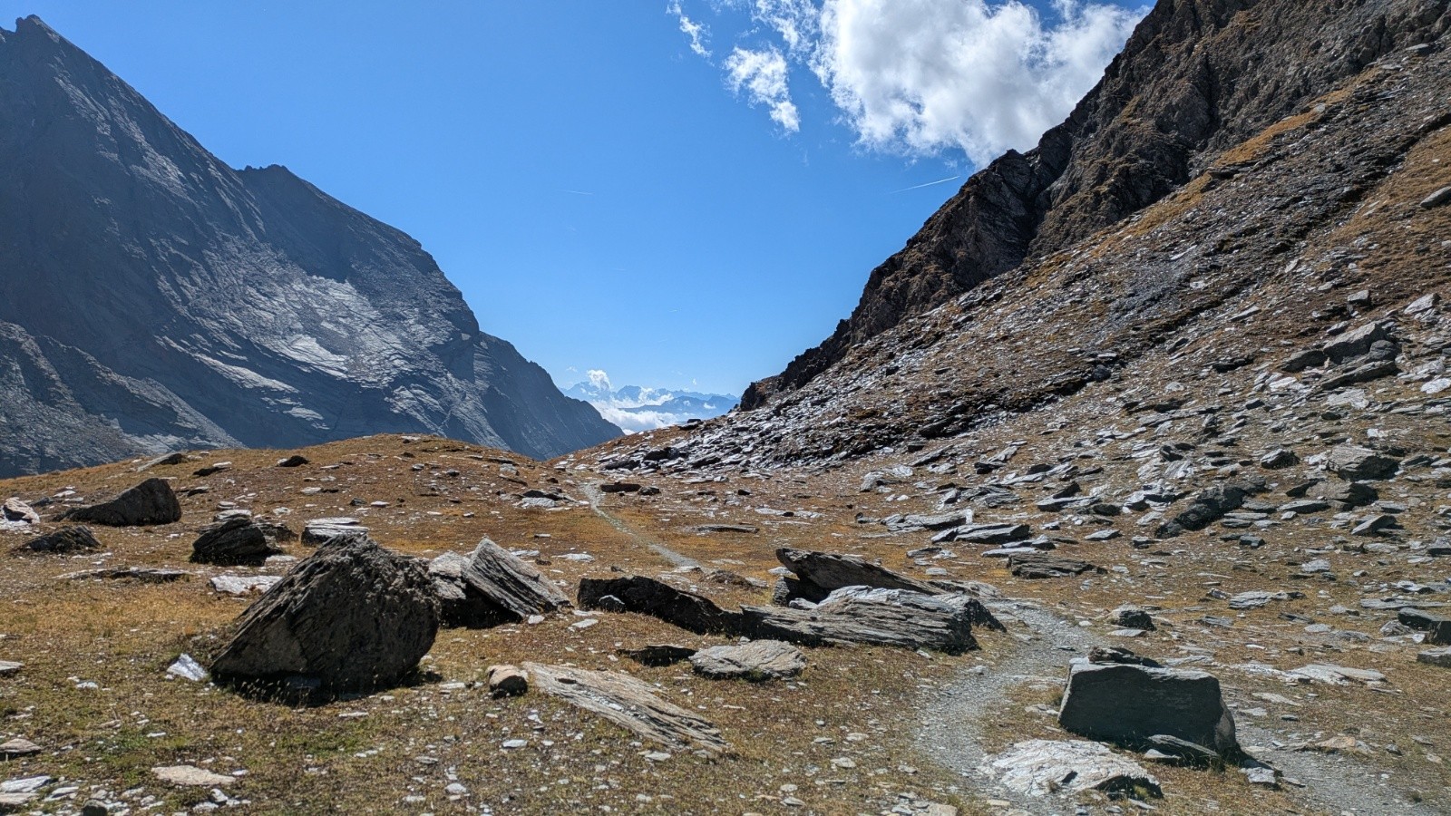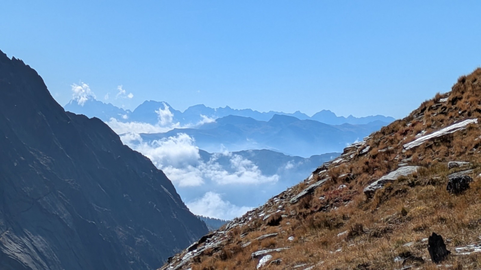 Je sors le col après une pause glucide sur le replat, 100m en dessous, et admire au loin les bouquetins qui nous surveillent depuis leur promontoire rocheux.