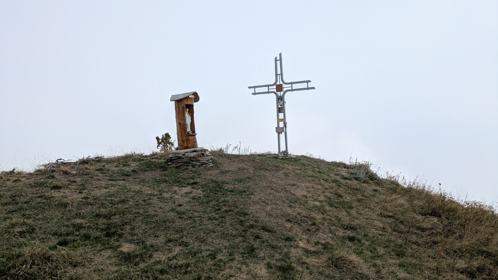 On atteint une croix en bord de falaise. La vue sur la vallée doit être fantastique (sans la nebbia 🤪).