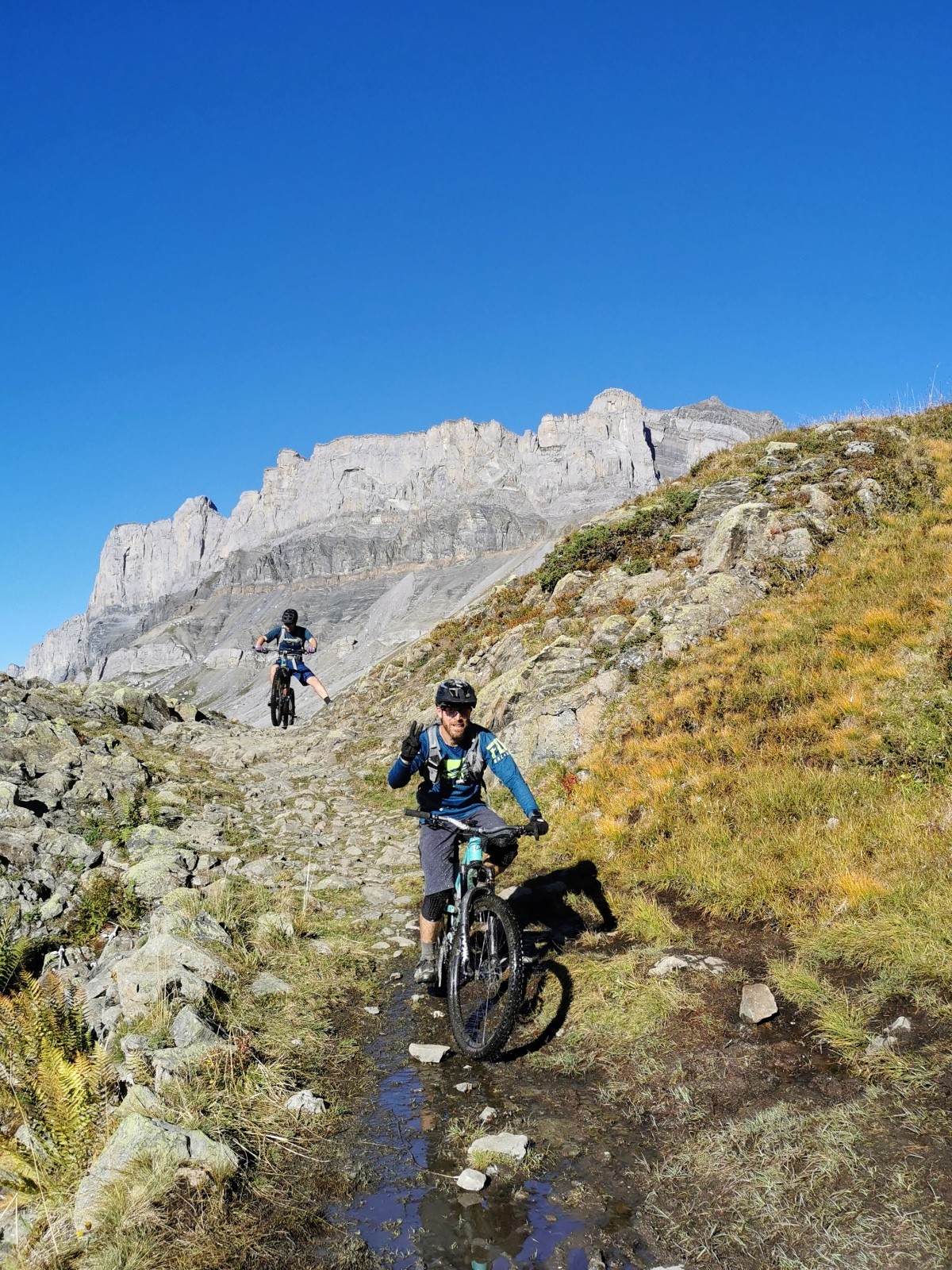 8h ! 😨 C'est le temps écoulé depuis le départ. On souffle un peu, on dévore le sandwich tel des affamés. Affamés oui, mais de descente aussi et elle va être fameuse. Un peu peur du monde et/ou du manque de grip (c'est ultra sec) mais au final tout passe plutôt bien avec quelques pieds à terre. Grand moment ici, sublimé par l'ivresse des sommets. Retour à Salenton et sa descente 5 étoiles, On se régale, c'est varié et ça roule à 100%.
