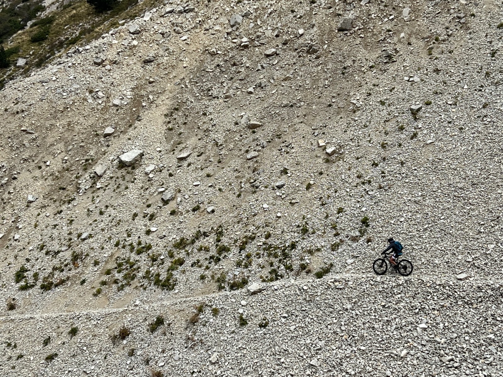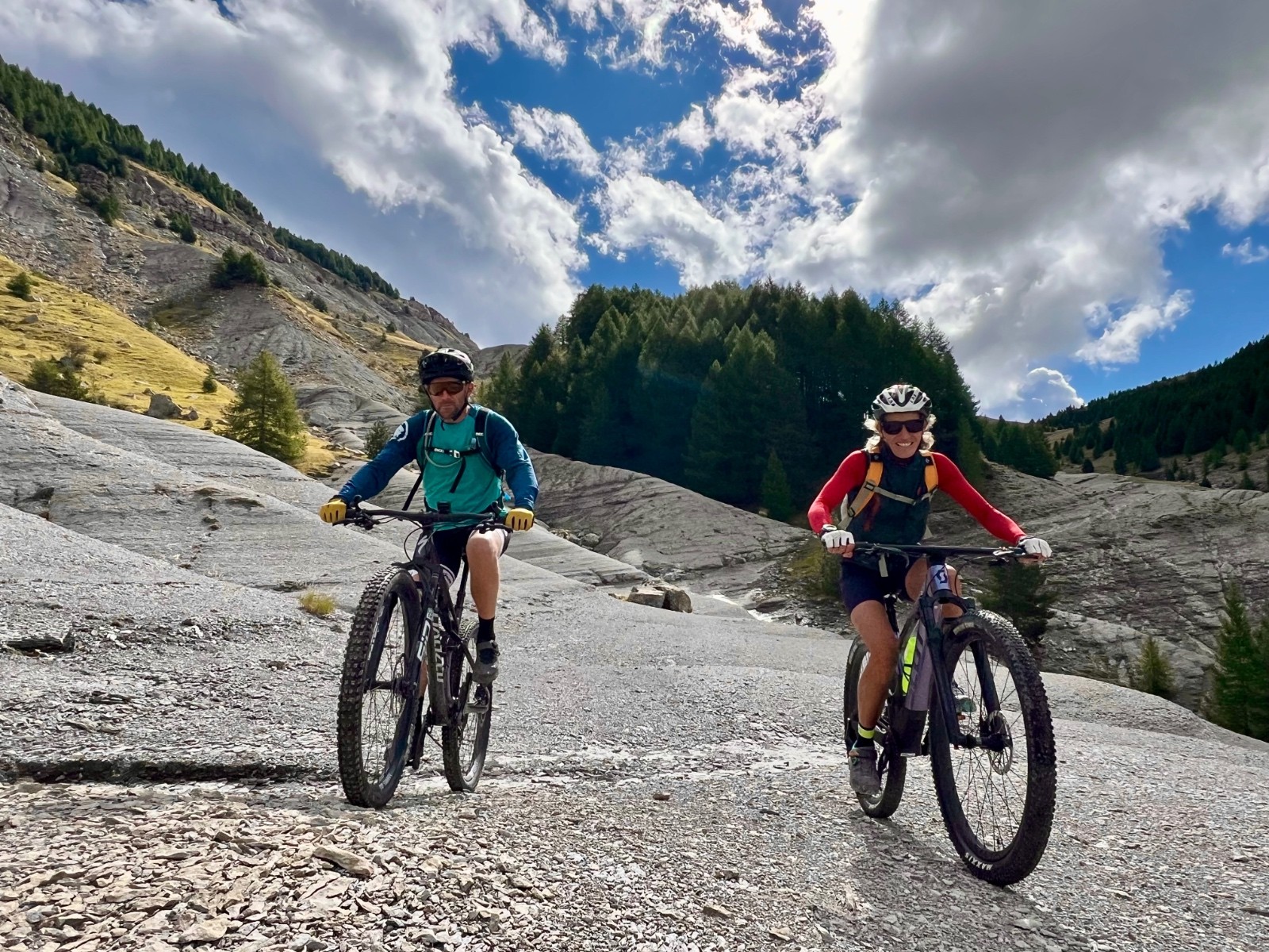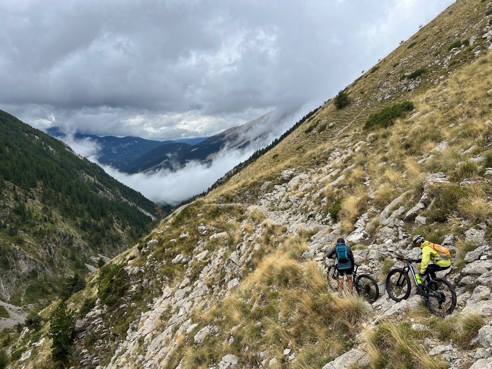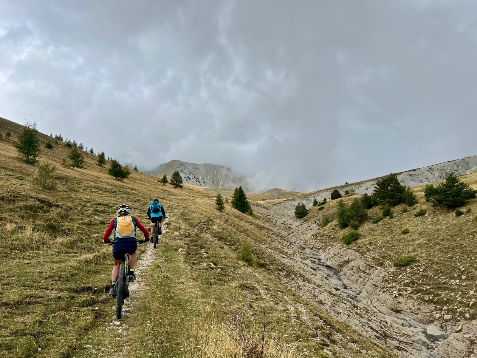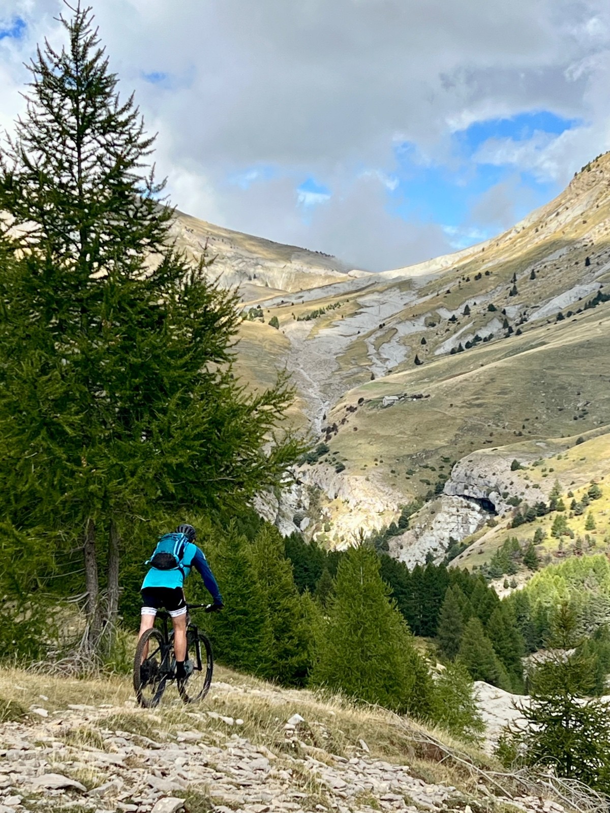 Après la découverte de la traversée de Chalufy avec bascule en Haute-Bléone, nous partons découvrir cette fameuse descente au pied de Boules. Joli tour que celui de Boules ( sans le sommet) avec Nathalie et Laurent depuis La Valette. La montée au plateau de Jaussaud est très raide, trop raide pour passer en musculaire mais beaucoup plus rapide que depuis Beauvezer via Pic de Mal Ubac. Les 3/4 en poussage. Passage des robines très esthétique et ludique. Aucun chien pour nous aboyer cette fois. Nous basculons vite vers la descente. Très beau single de montagne étroit mais avec descente obligatoire ( pour nous) du vélo à trois reprises jusqu’à la cabane de Boules très exotique. Seconde partie roulante jusqu’à La Valette. Une belle sortie difficile en montée pour amateur de poussage !