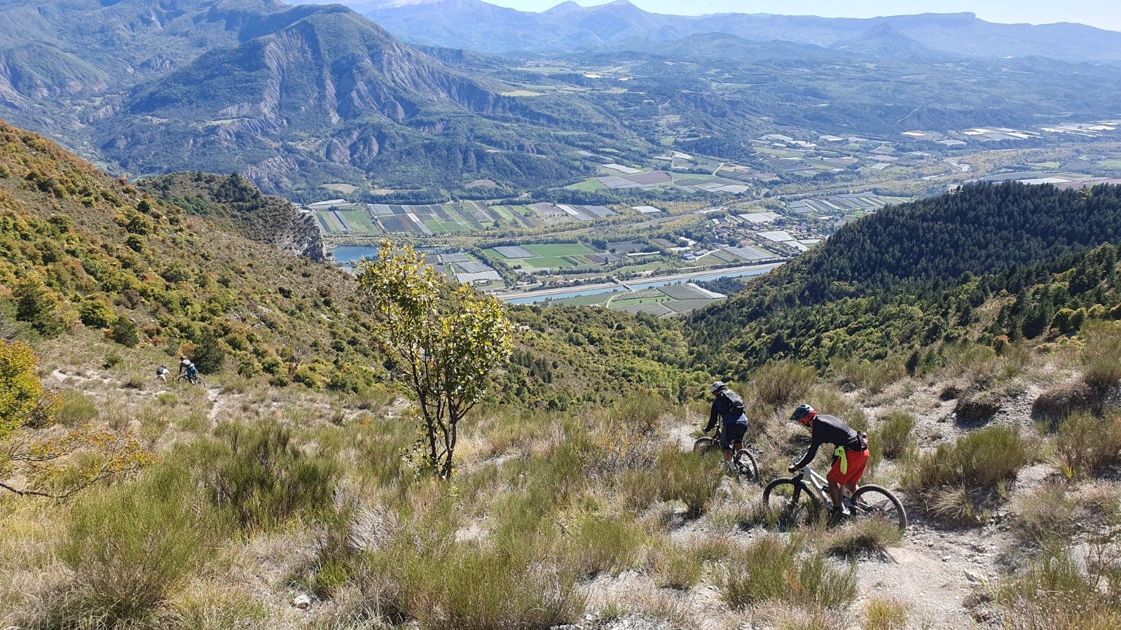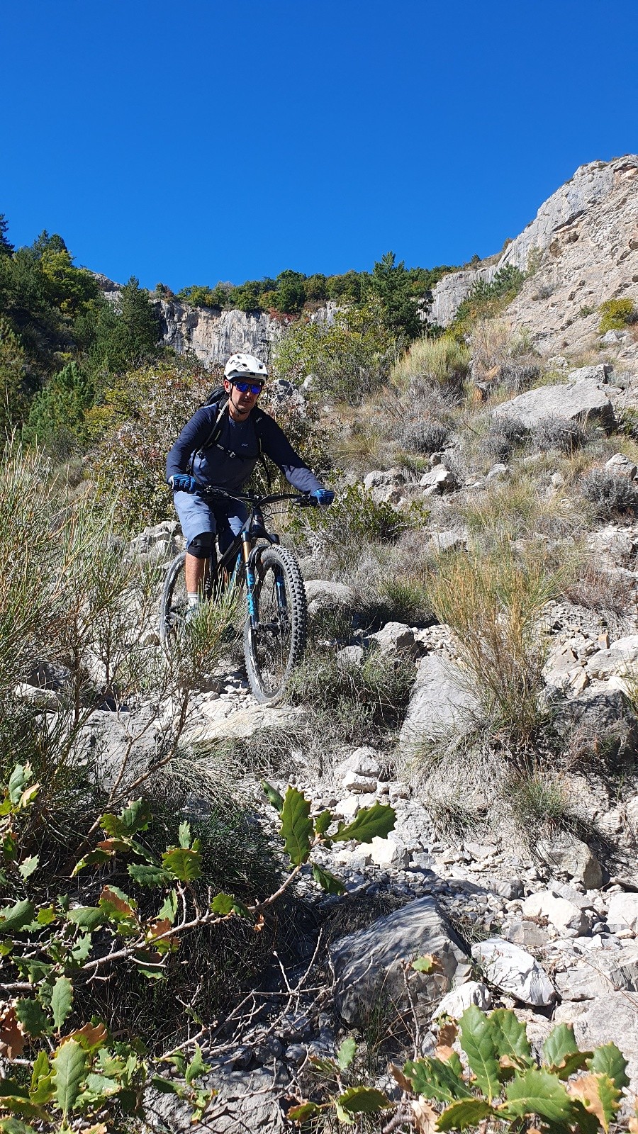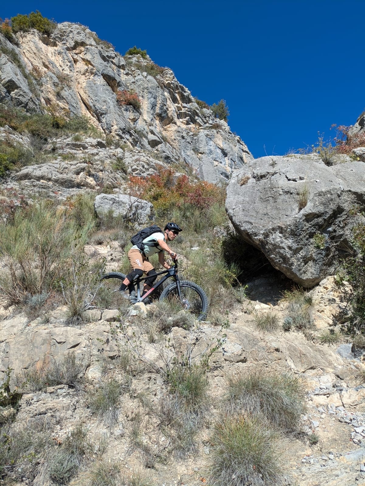 C'est plus fuyant, aride, et un cran au dessus en terme de technicité avec des marches et blocs. Le sentier se fraye un passage entre les barres rocheuses. Les meilleurs passeront tout sur le vélo, les autres un petit peu moins 🙂.