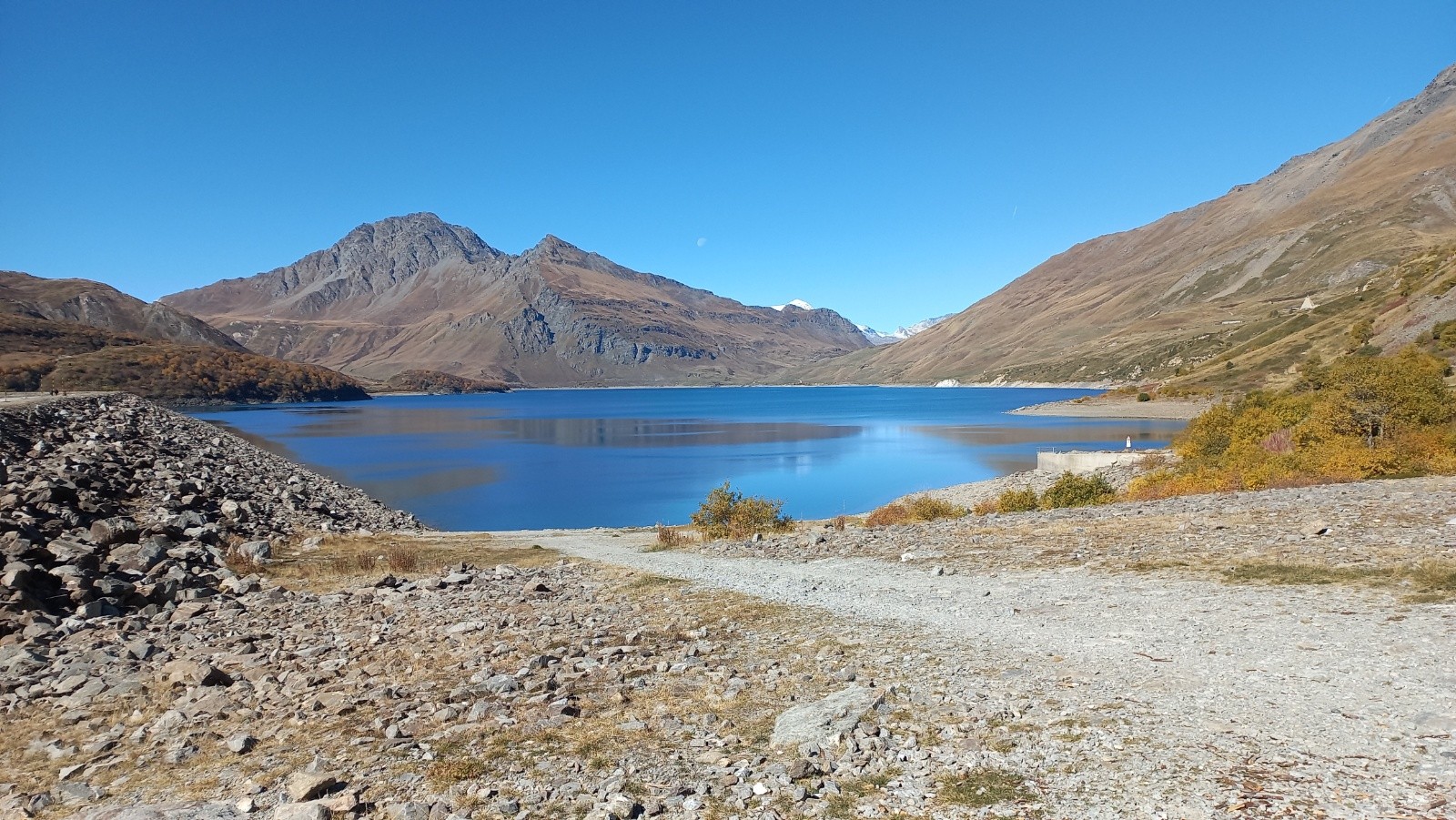 Je rejoins tant bien que mal le lac blanc et croise les premiers randonneurs. La descente vers le barrage du Mont Cenis s'effectue dans un premier temps sur une sente bien marquée et très agréable à rouler qui n'apparait pas sur la carte IGN. Je rejoins la piste un peu plus bas. Elle zigzag pas mal et j'emprunte parfois les raccourcis. C'est 50/50, certains sont faciles et roulants, d'autres très creusés et cassants (et pas encore de mon niveau). Donc parfois je roule, parfois je pousse, c'est le jeu ma pauvre Aurore! Au moins j'aurai essayé!