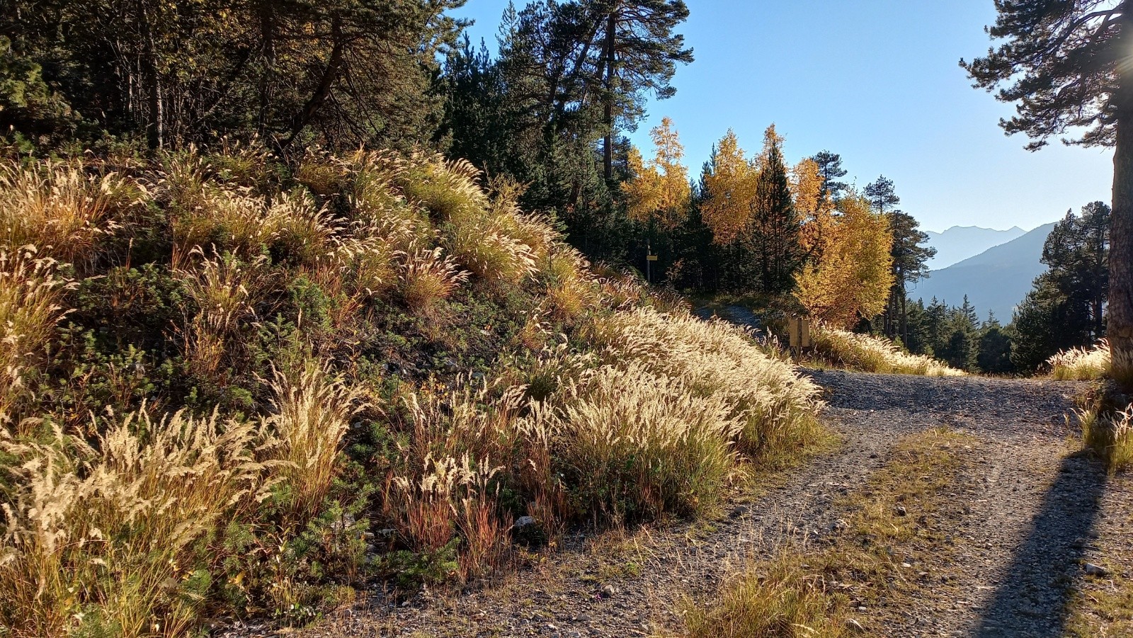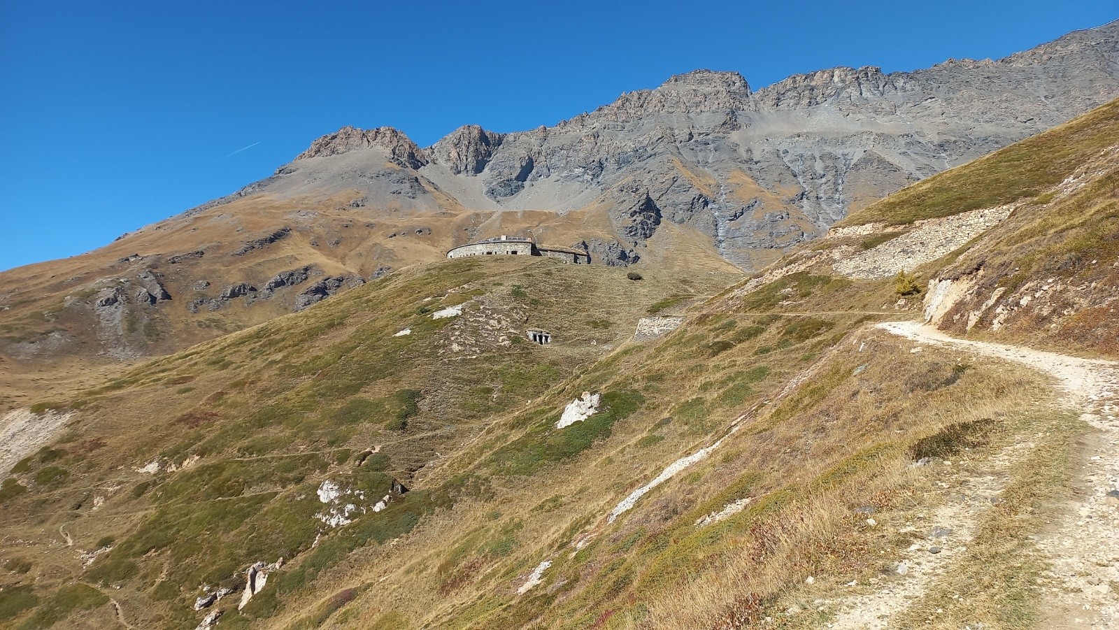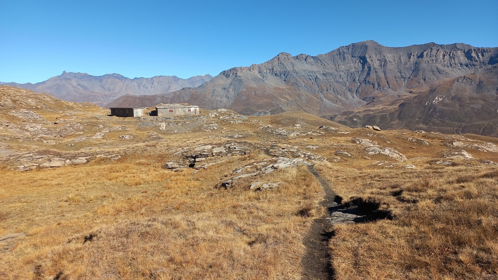 Le sentier vers le petit Mont Cenis est parfait pour me requinquer et me redonner foi en ce projet. Jamais dur, peu pentu avec une belle vue dans un paysage très ouvert tout orangé, c'est le pied! La descente est trop vite achevée, il faut de nouveau pédaler. La première partie vers le lac de Savine se fait sur un gros chemin où je croise un paquet d'Italiens qui en reviennent. Puis le chemin se fait sentier de plus en plus accidenté et viens le moment où il faut pousser. J'arrive péniblement au lac et me jette sur le premier spot plat pour planter la tente avant la nuit. Je suis seule au monde et c'est bien ce que je cherchais. Quelques bouses de vaches séchées témoignent du passage des troupeaux.
