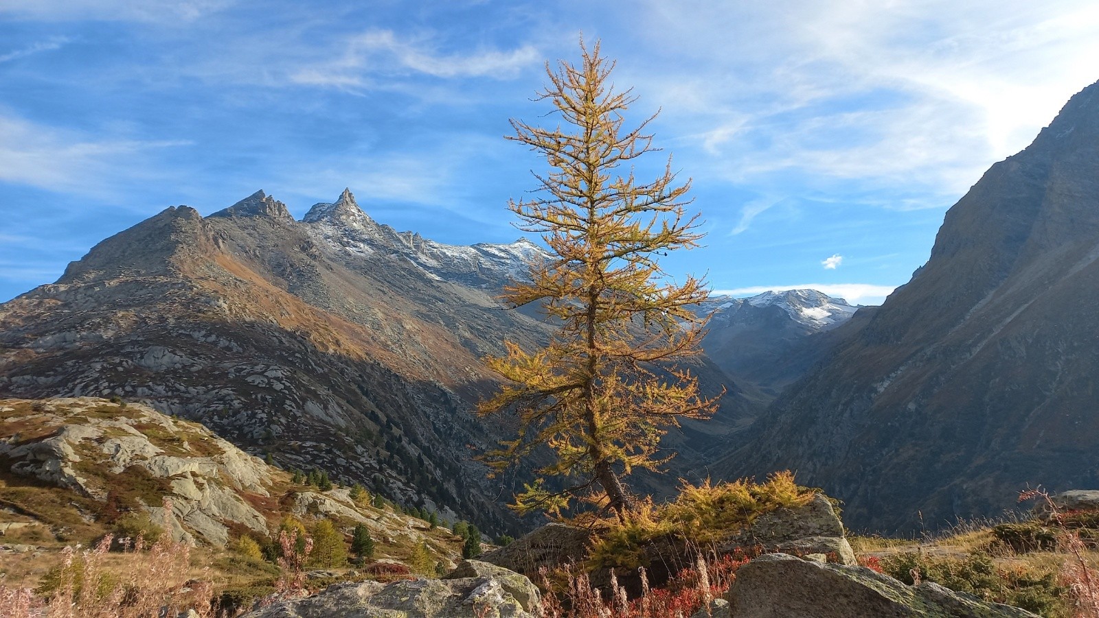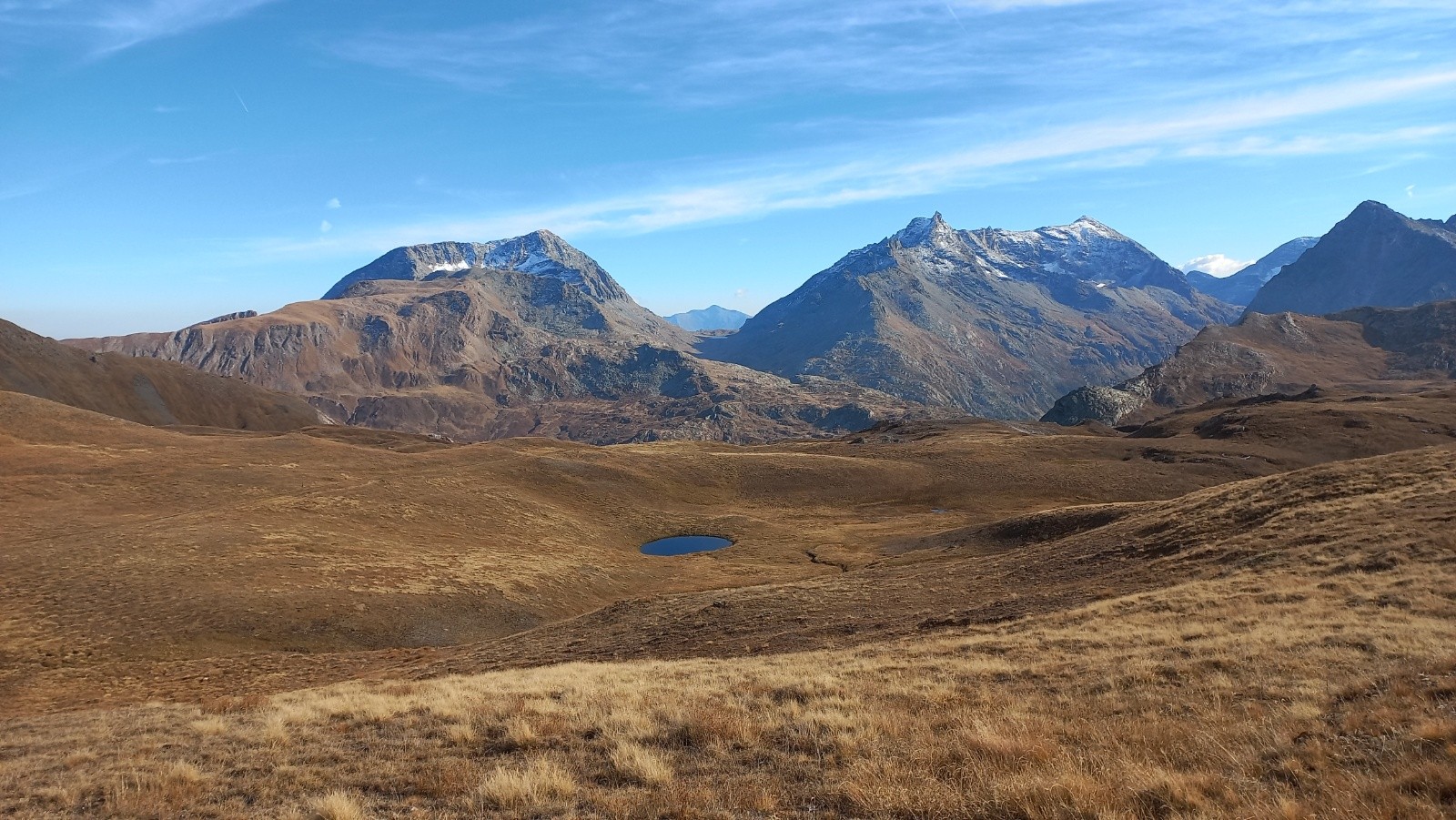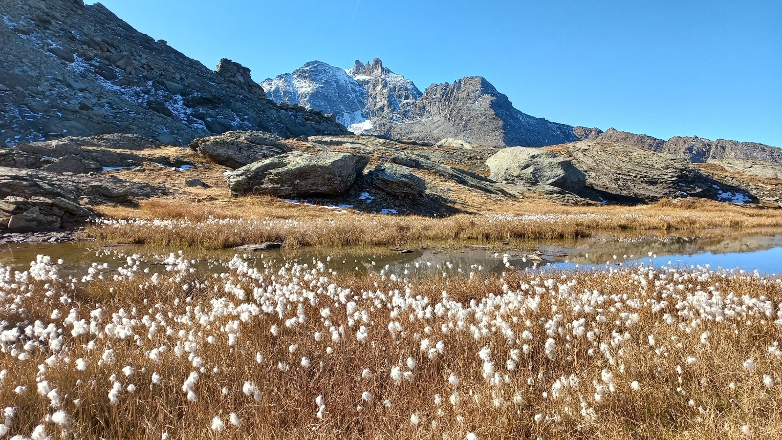 Je récupère donc mes effets personnels et c'est parti pour la montée. Si j'avais espéré pouvoir pousser une bonne partie de la montée, je me fourvoyais grandement. C'est près de 300m de D+ où il faudra porter avec deux passages un peu plus sioux. C'est donc avec mes 20kg sur le dos que j'avance à pas de fourmis. Doucement mais sûrement, j'atteins les lacs Giaset. C'est somptueux avec toutes ces couleurs. Et les Dents d'Ambin, que je photographierai une bonne dizaine de fois, sont majestueuses avec leurs tâches de blanc. Je m'octroie une pause café-graine, à défaut des croissants, avant de poursuivre mon chemin.