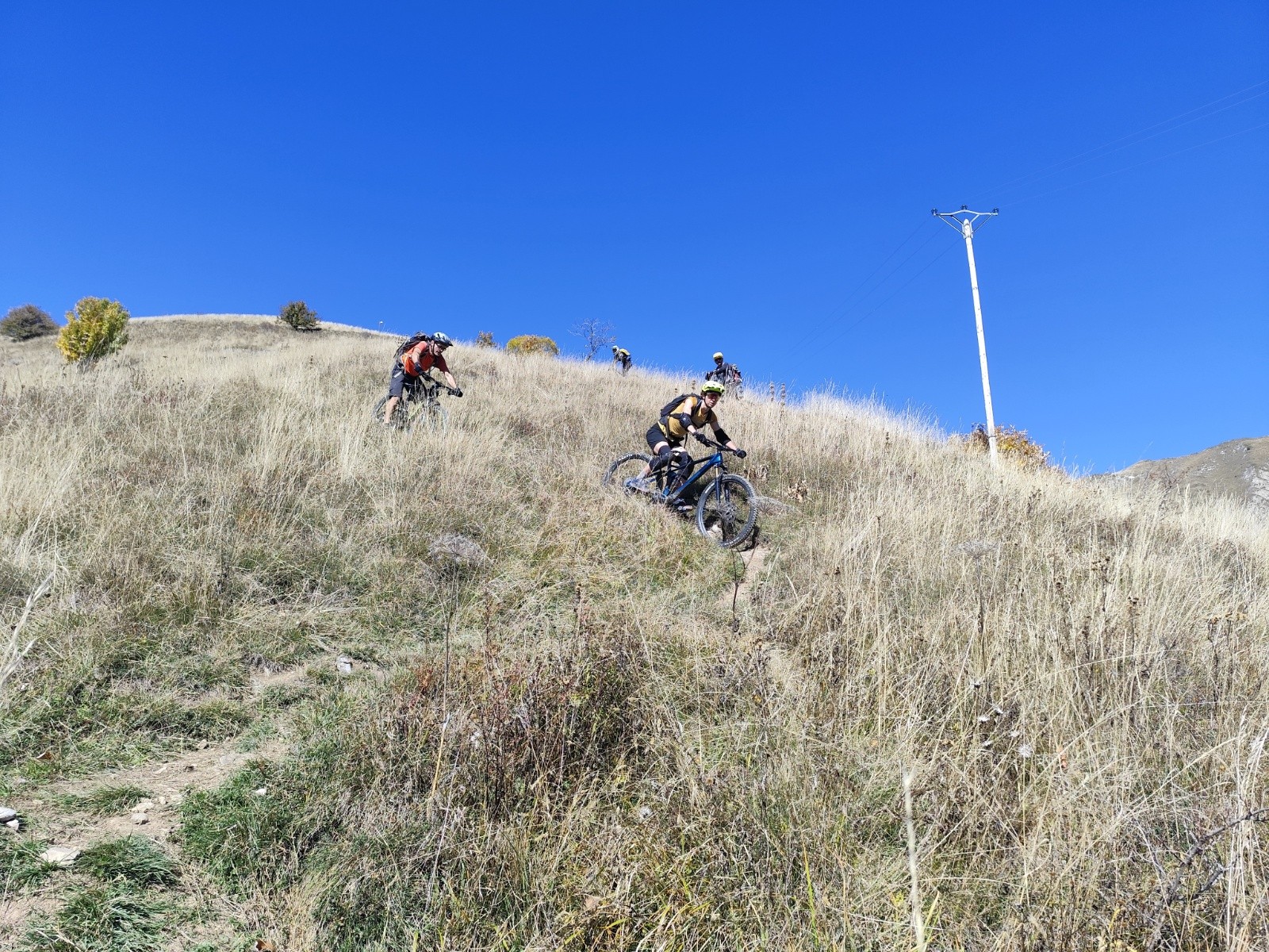 Toute autour les différentes scènes de l'apparition mariale sont matérialisées par des statues de bronze grandeur nature. On n'a pas eu le droit à une apparition ce Dimanche excepte les vautours planant au dessus de nous. Le sommet du Gargas nous tentait bien mais c' était l'heure du pique-nique et on s'épargnera 1h de poussage en choisissant de s'installer au soleil sous la croix plein Sud. Au panoramique se distinguent clairement les principaux sommets du Dévoluy que sont la Grande tête de l'Obiou, le Grand Ferrand, la tête de Garessier, la montagne de Faraut les différentes têtes, des Ormans des Cavales, de l'Aupet, d'Oriol, plus proche le pic Pierroux et de Chauvet et en fond de toile le plateau de Bure. 5 vautours nous feront leur spectacle en tournant au dessus de nous mais ceux la on ne les nourries pas comme des moineaux ou choucas avec des galettes proposées par Vincent. Pause terminée on attaquera la partie singles vers la chabannerie. Petit festival d'épingles ou chacun s'adonnera selon son niveau au choix des noses-turn ou des virages enroulés. Quelques épingles seront un peu plus corsées pour le challenge et c'est toujours un plaisir de les refaire sans mauvaise chute. On choisira de sacrifier la descente de Peyrague pour s'orienter sur Boustigue. Descente rapide puis remontée soutenue par la route pour rejoindre son petit Hameau. On s'équipera sous la bassecours des poules, lapins, pintades, dindons, paons avant d'entamer la dernière descente. Côtée noire T4, elle serait plutôt T3 car nettoyée de ses graviers et pas trop technique. Le terrain étant sec chacun y prendra son plaisir dans l'enchainement des epingles. Le débriefing se fera autour d'un pot commun.