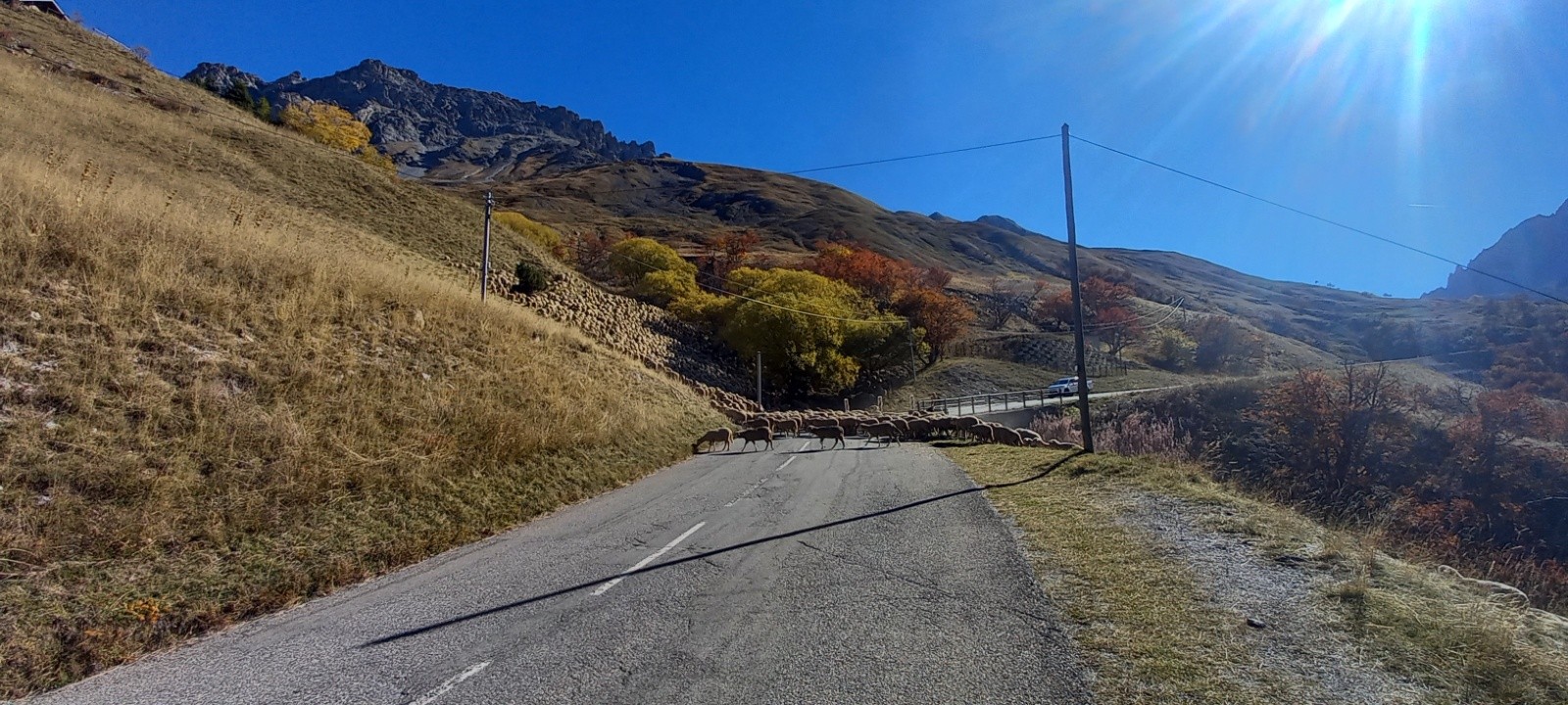 Remontée par la route, car je veux éviter le poussage par le sentier direct. Un gros troupeau de mouton qui traverse (2500 bêtes), me permet de faire une pause.