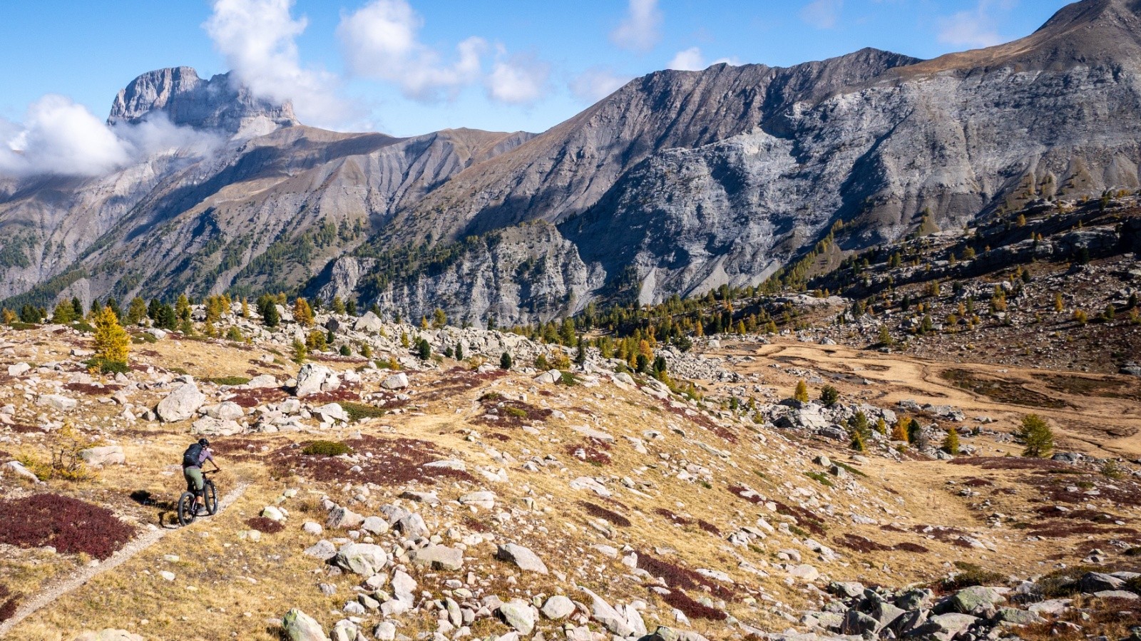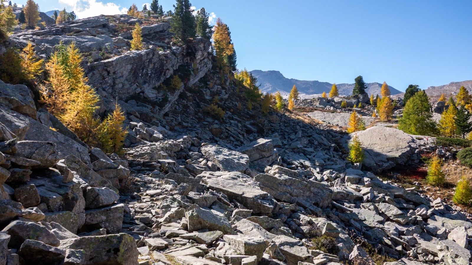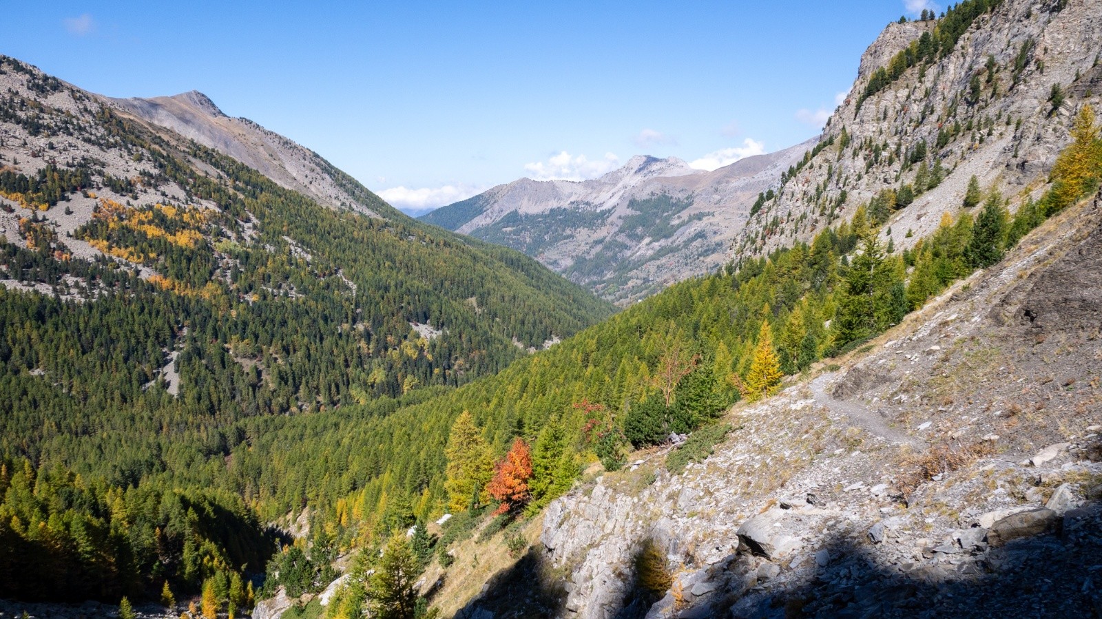 En sortant de la forêt aux couleurs automnales, le paysage s'ouvre sur un vallon d'une grande beauté. La montée se poursuit de manière régulière jusqu'au franchissement de la Barre de Vautreuil. C'est à partir de ce point que le terrain devient plus sauvage : le sentier disparaît. Il faut alors se fier aux quelques traces rouges et aux petits cairns épars. La progression, bien que hors sentier, est grandement facilitée par la présence de nombreuses traces de bouquetins. Je m'attendais à une section éprouvante, mais la beauté du site a rendu le temps de passage jusqu'au Col de Vautreuil très agréable.