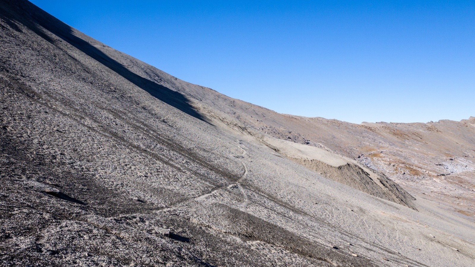 La descente a offert une belle surprise avec une première section "freeride" marquante. Dans une forte pente composée d'une sorte de sable compact (rappelant la texture du Monte Salsa), le terrain s'est révélé étonnamment roulant pour qui accepte l'inclinaison.