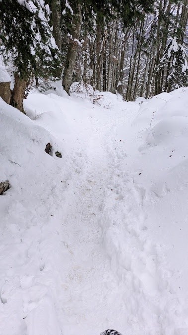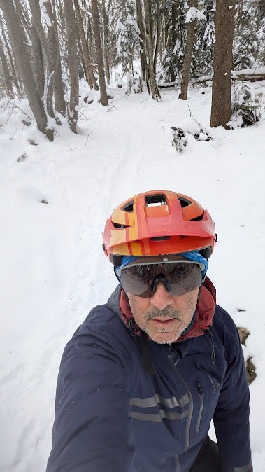 L'avantage du VAE, c'est que même sans énorme envie vu les conditions, un emmitouflage efficace, le moteur en mode auto, voir turbo dans les grosses montées, et je me retrouve à enchainer les petits sentier du coin