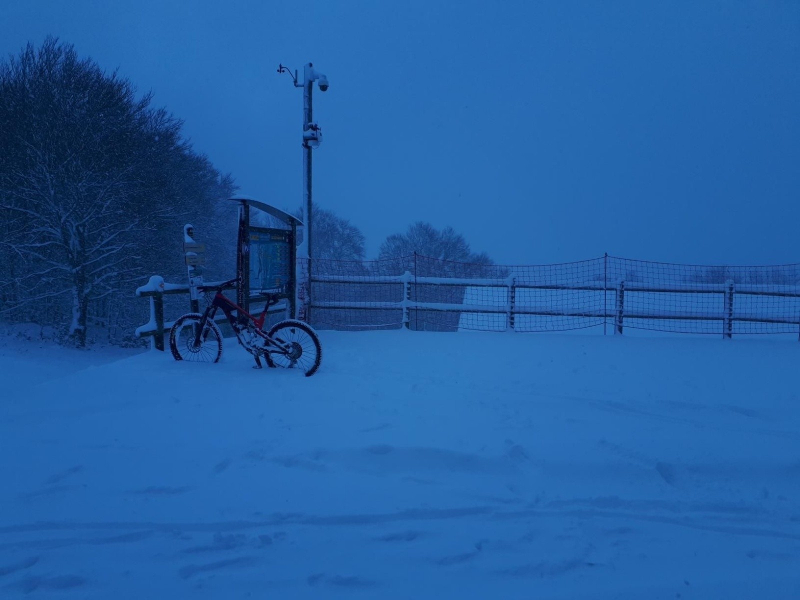Pluie à la maison, mais neige sur les hauts, direction mon classique Sur Lyand. Départ sous la pleige (mélange de pluie et de neige), puis rapidement il neige bien. La route est dégagée jusqu'à l'auberge, ça roule un peu ensuite, mais la fin est en poussette car trop de neige légèrement compactée par le vent. Je pousse à la croix et tente la crête nord, ça roule, mais la descente est inroulable, retour sur la route.