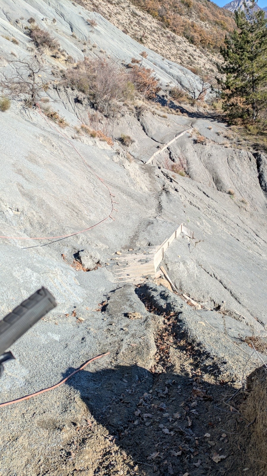 A partir de la Croix, l'itinĂ©raire pour atteindre la crĂȘte des chamois est long mais on ne s'ennuie pas car il y a qqs challenges, de bons raidars, des Ă©pingles Ă passer et un micro toboggan Ă nĂ©gocier avec la corde (rose) ou pas. J'adore ce type de sentier oĂč tu sens que les mecs ont cogitĂ© avant de piocher đ.