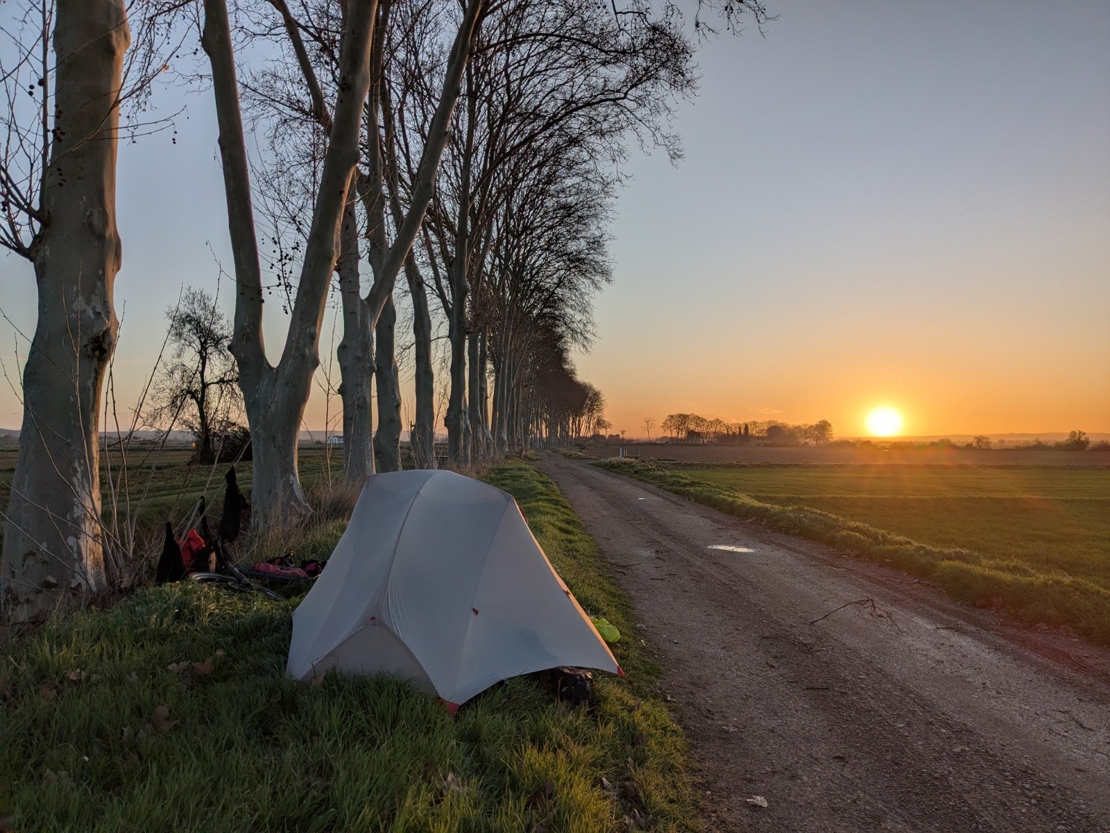 c'est le desespoir - La pluie est annoncée a 9h - je pars a 6h du matin, de nuit pour gagner un bar - pas de chance - elle s'invite plus tot - j'arrive trempée et desesperée - Je n'ose pas sortir de ce bar de toute la journée pour ne pas mouiller mon unique change sec - je checke toute la journée les variantes de plans -mais météo blue ciel ou france est incapable d'indiquer quelquechose de pertinent sur le vent - le soir, enfin je sors - je trouve un endroit entre deux arbres isolés potable et correcte - tout est detrempé - tout est calme et serein - bonne nuit -