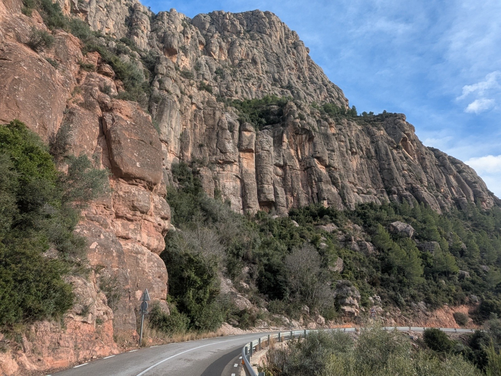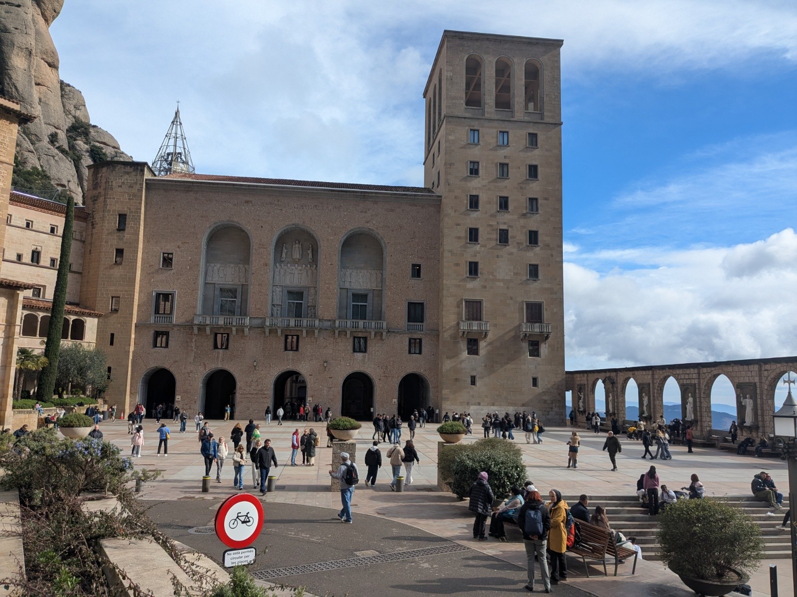 La montée de Montserrat se fait par la route - c'est donc facile et c'est jolie - j'aime les montagnes - la route est peu fréquentée - la haut : retrouvaille de la faune humaine en densité max - ce monastere est néanmoins magnifique , coincé dans les montagnes - la suite de la route est jolie jusqu'a ce que la trace se trouve parallèle a l'autoroute - le vent aide a réduire le bruit des voitures de l'autovia - la route est une piste cyclable géante - elle est desertée des voitures -