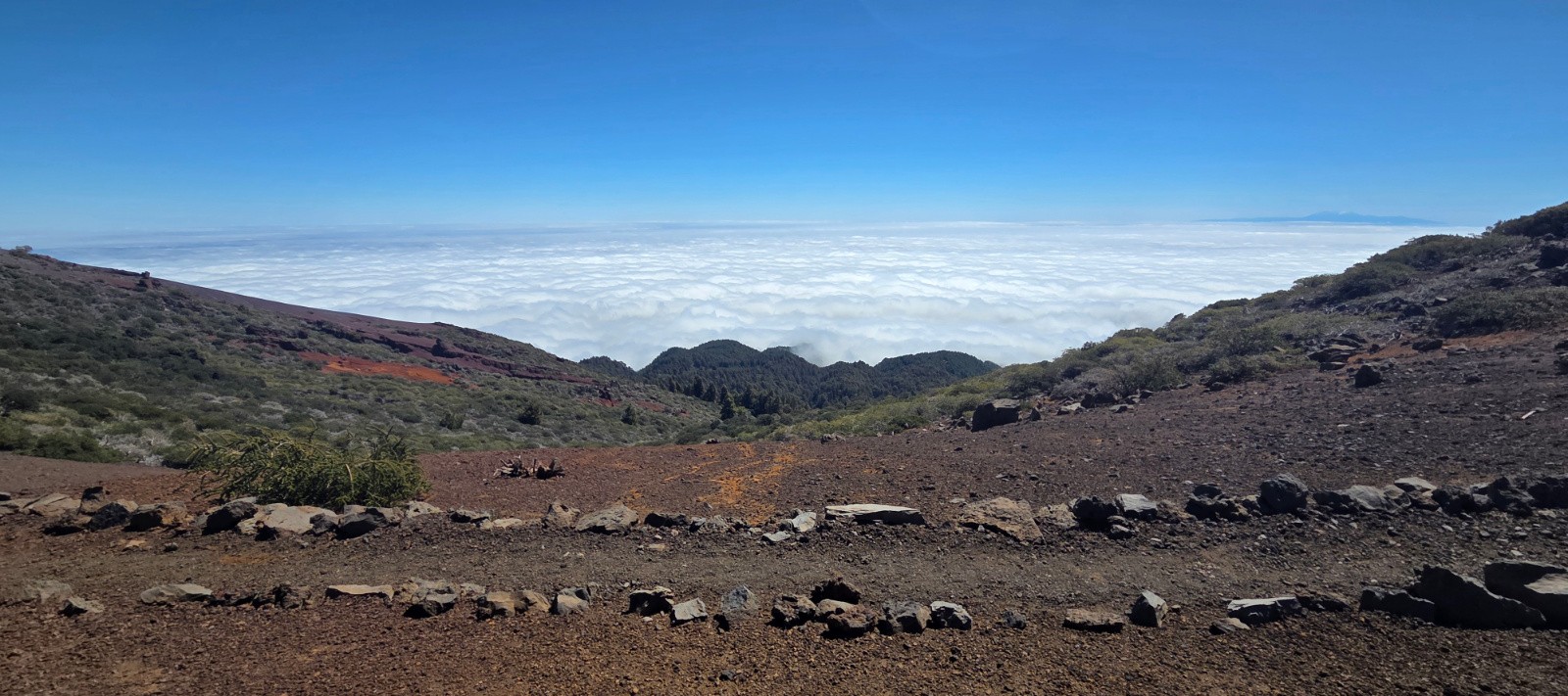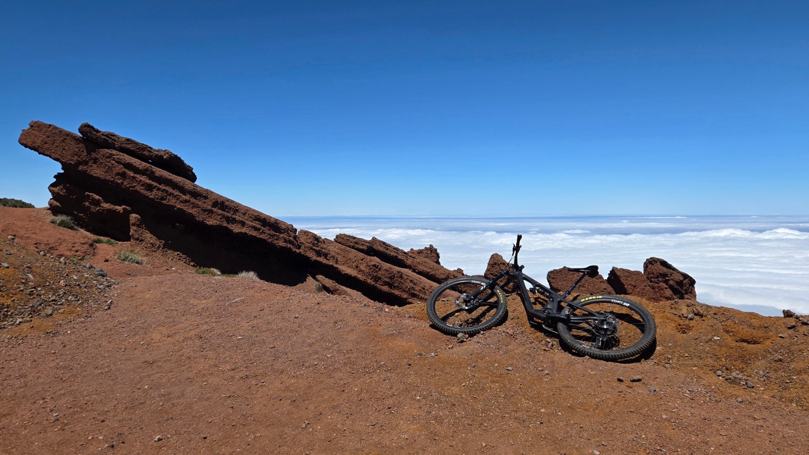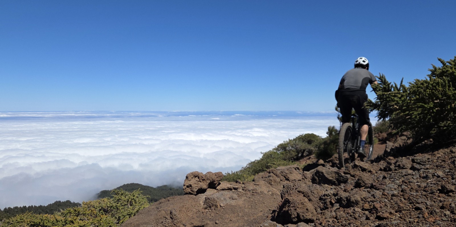 J2 : On monte au-dessus des nuages. Après une rando familiale pour atteindre la Caldeira de Taburiente, je prolonge par un itinéraire VTT. Remontée pour la route pour atteindre le Pico de la Cruz (2350m), le sentier longe ensuite la Caldeira sur son versant ouest. Magnifique sentier de crête, technique et rocailleux, avec néanmoins beaucoup de relance en montée (dont poussage / portage) qui casse un peu le rythme. Traversée du nuage, on passe en quelques secondes d’un grand soleil à une petite pluie… Final en mode marteau piqueur sur un chemin caillouteux vers Santa Cruz. Descente jusqu’à la mer😊