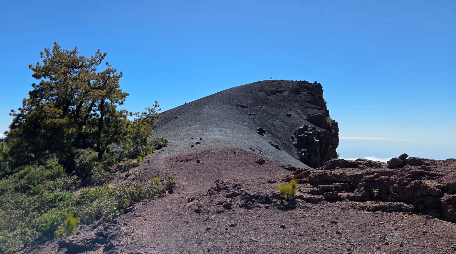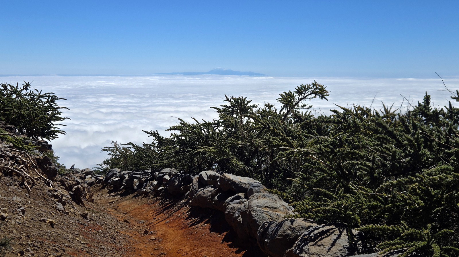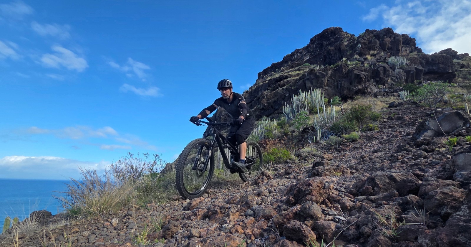 J2 : On monte au-dessus des nuages. Après une rando familiale pour atteindre la Caldeira de Taburiente, je prolonge par un itinéraire VTT. Remontée pour la route pour atteindre le Pico de la Cruz (2350m), le sentier longe ensuite la Caldeira sur son versant ouest. Magnifique sentier de crête, technique et rocailleux, avec néanmoins beaucoup de relance en montée (dont poussage / portage) qui casse un peu le rythme. Traversée du nuage, on passe en quelques secondes d’un grand soleil à une petite pluie… Final en mode marteau piqueur sur un chemin caillouteux vers Santa Cruz. Descente jusqu’à la mer😊