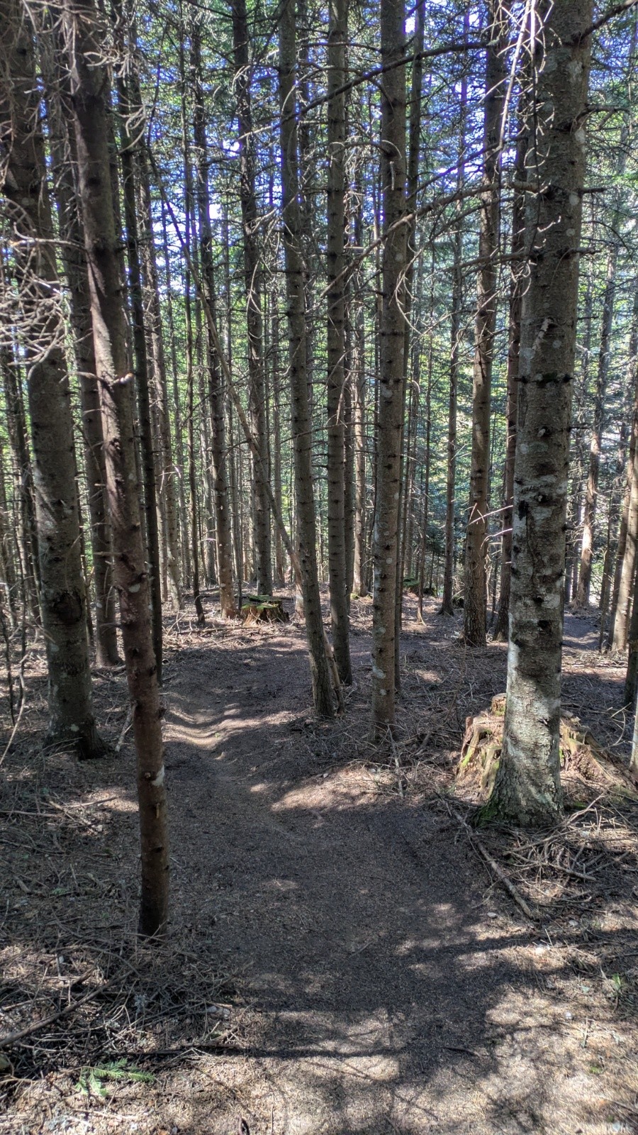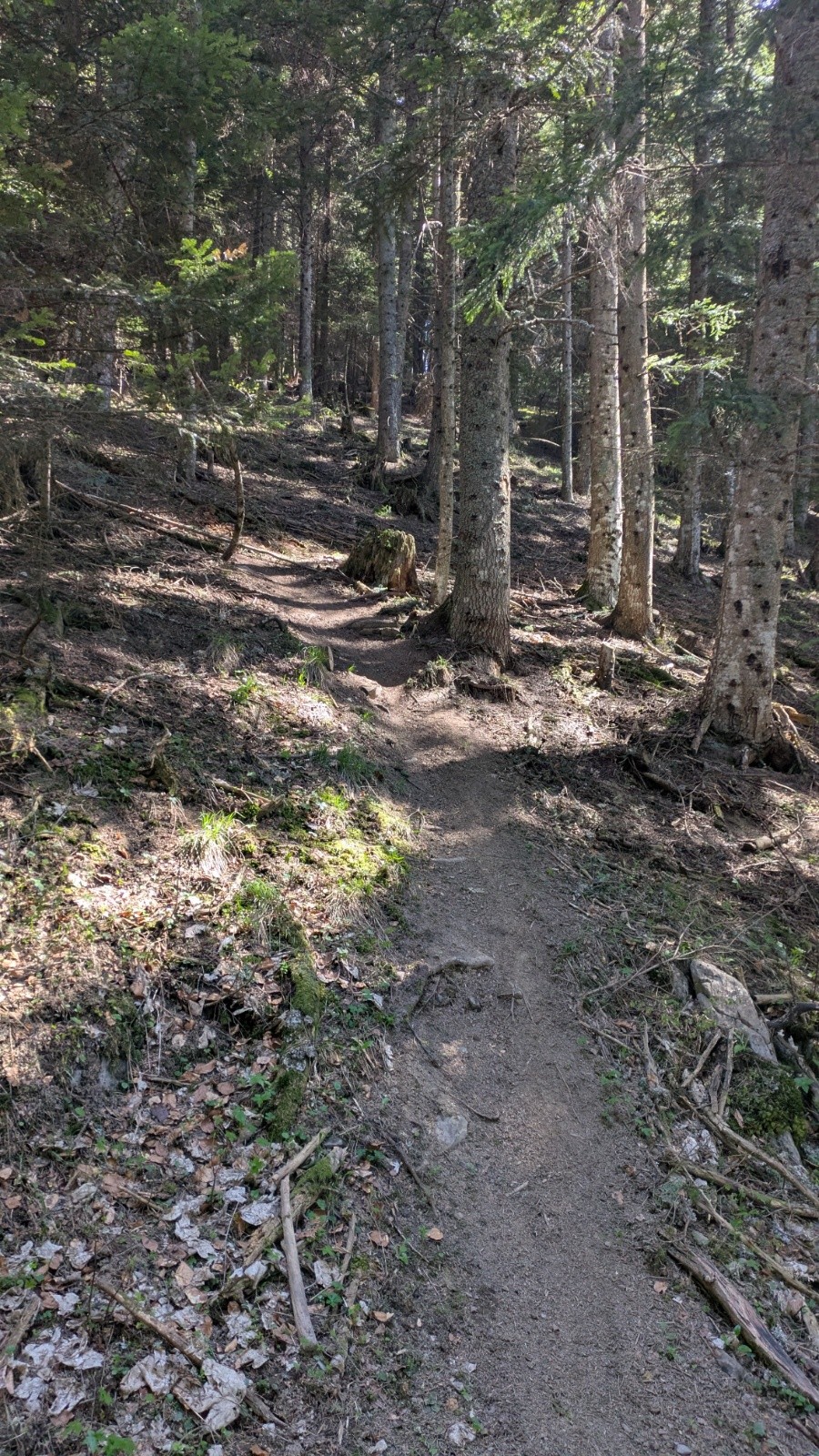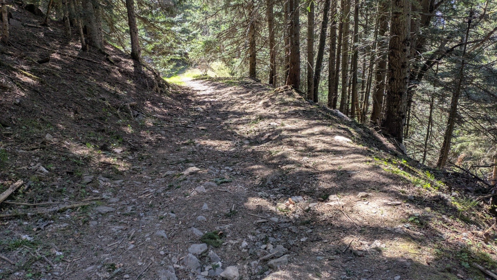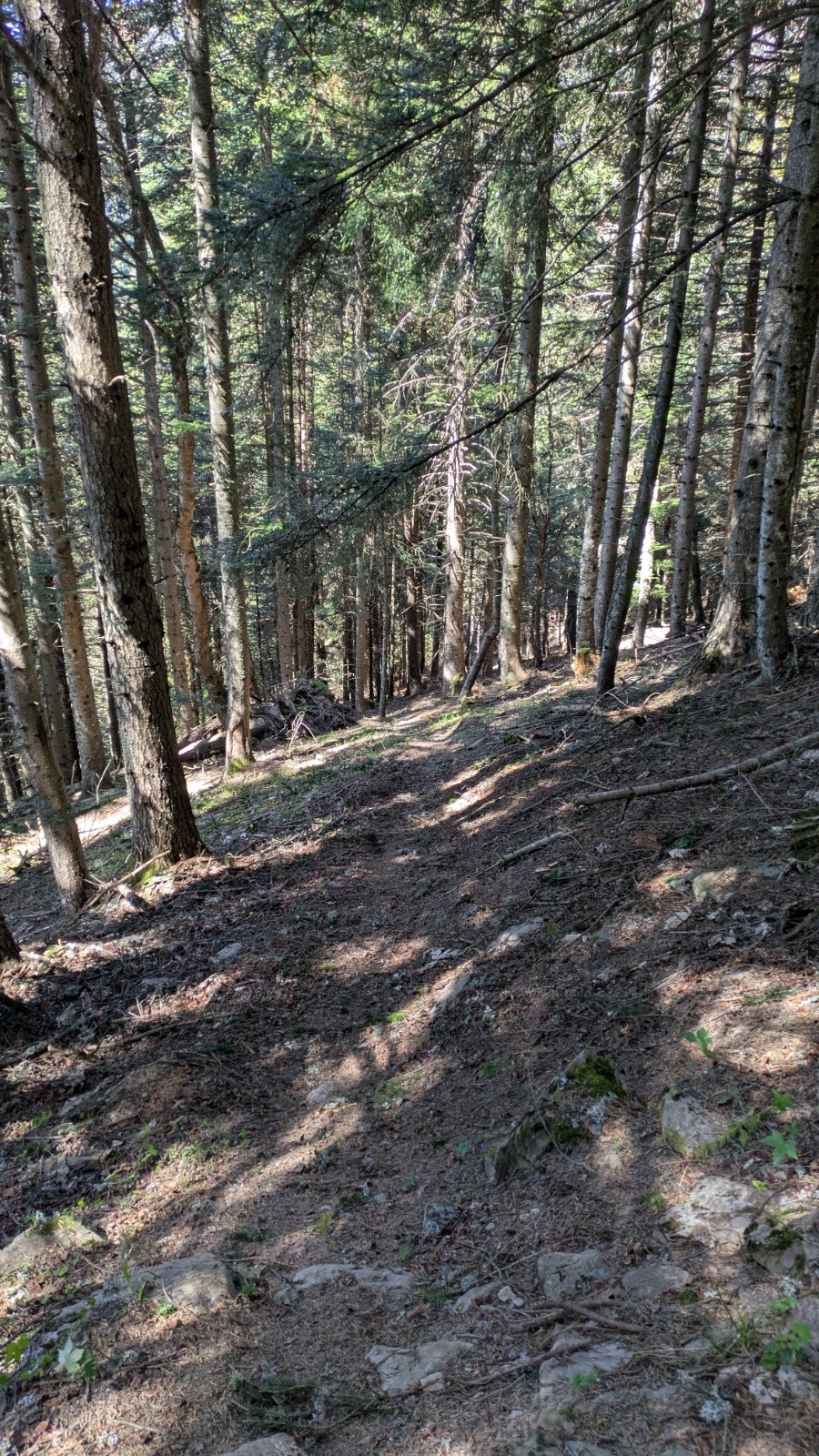 Tout est sec. Un peu trop car dans le raide pentu, même sur les freins, la bicyclette accélère. Ensuite 2 choix : tu sautes du vélo / tu engages pour le virage. Dans les 2 cas, on prend son pied et adrénaline garantie.🤪