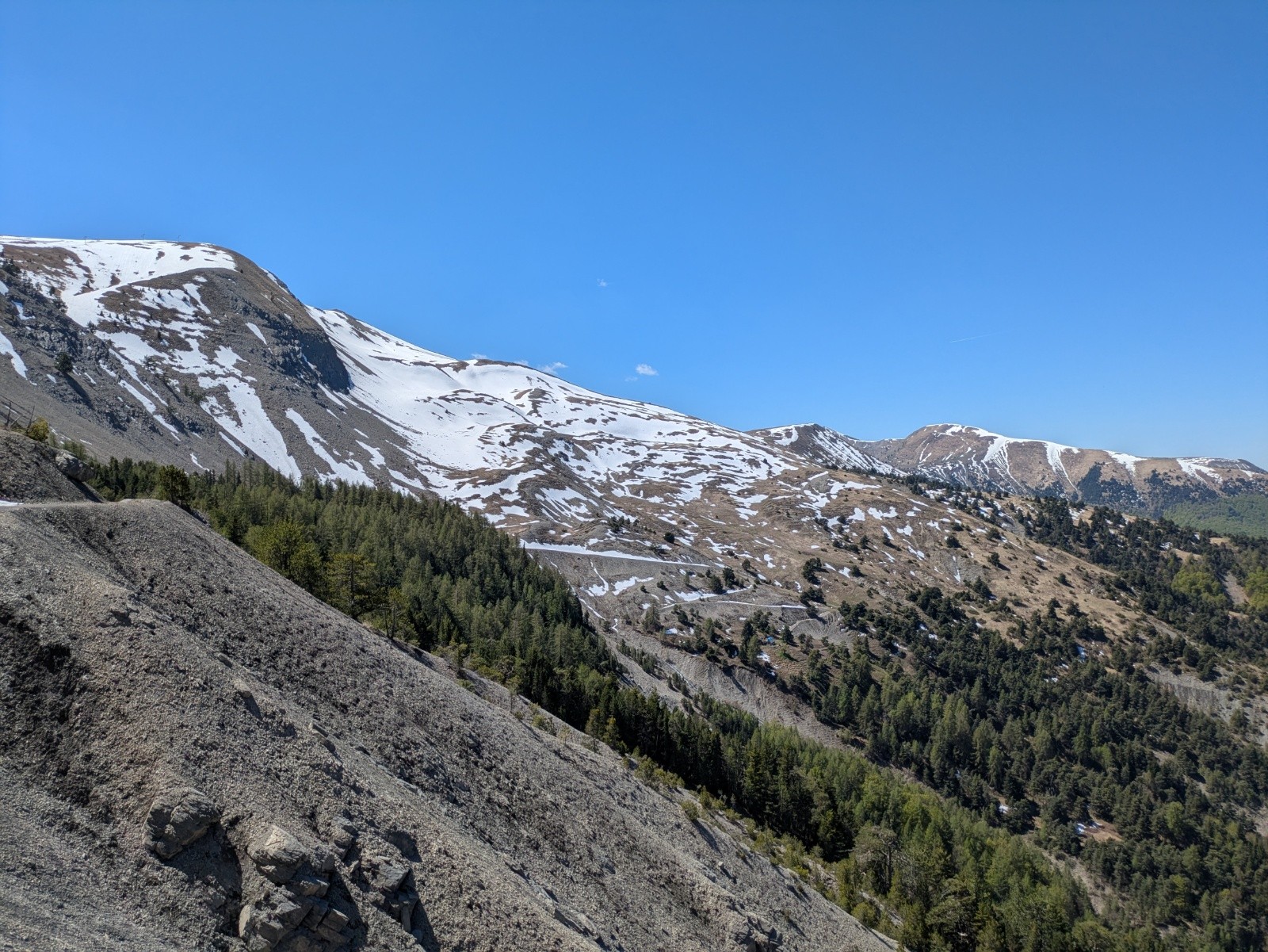 Longue montée sur route puis piste jusqu'à la crête des Mélèzes et qui permet d'observer les versants et crêtes sur l'itinéraire, il y aura de la neige ! À partir de ce point on bascule dans une ambiance montagne.