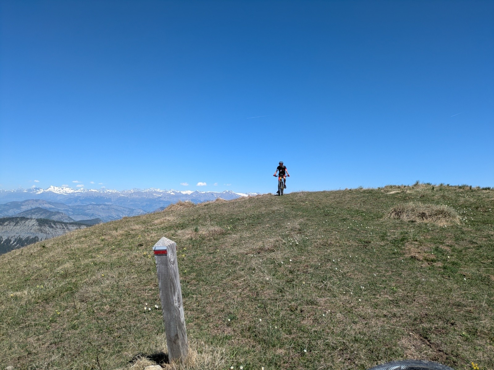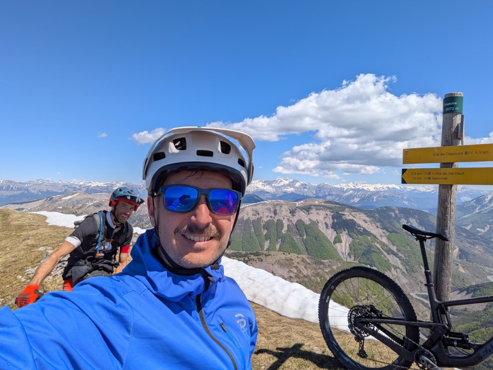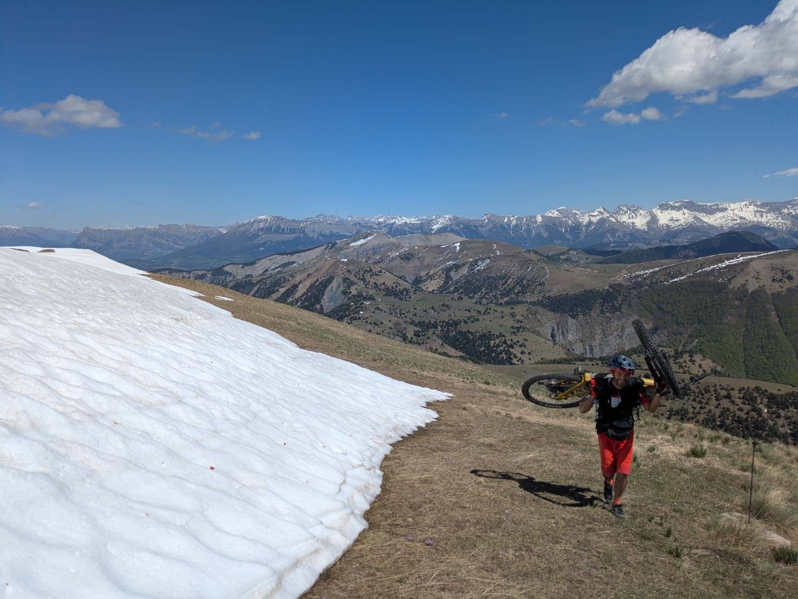 Très beau et solitude totale, montée à flanc pour rejoindre les crêtes à Sauvegréous. Quelques névés, mais au final rien de méchant, juste de quoi se mouiller les chaussettes. Les crêtes sont assez pénibles à rouler en montée, aucun sentier ça prend du jus. On fait quelques poussages et portages pour atteindre l'Oratoire avec quelques gros névés au passage et le final en neige. Bonne nouvelle, totalement sec côté descente.