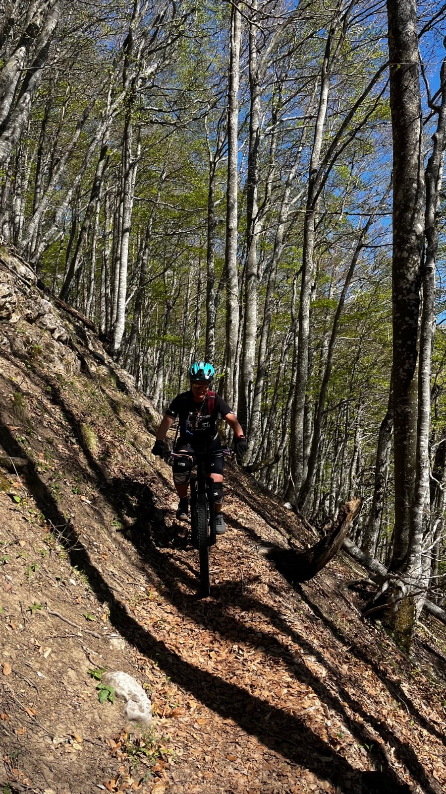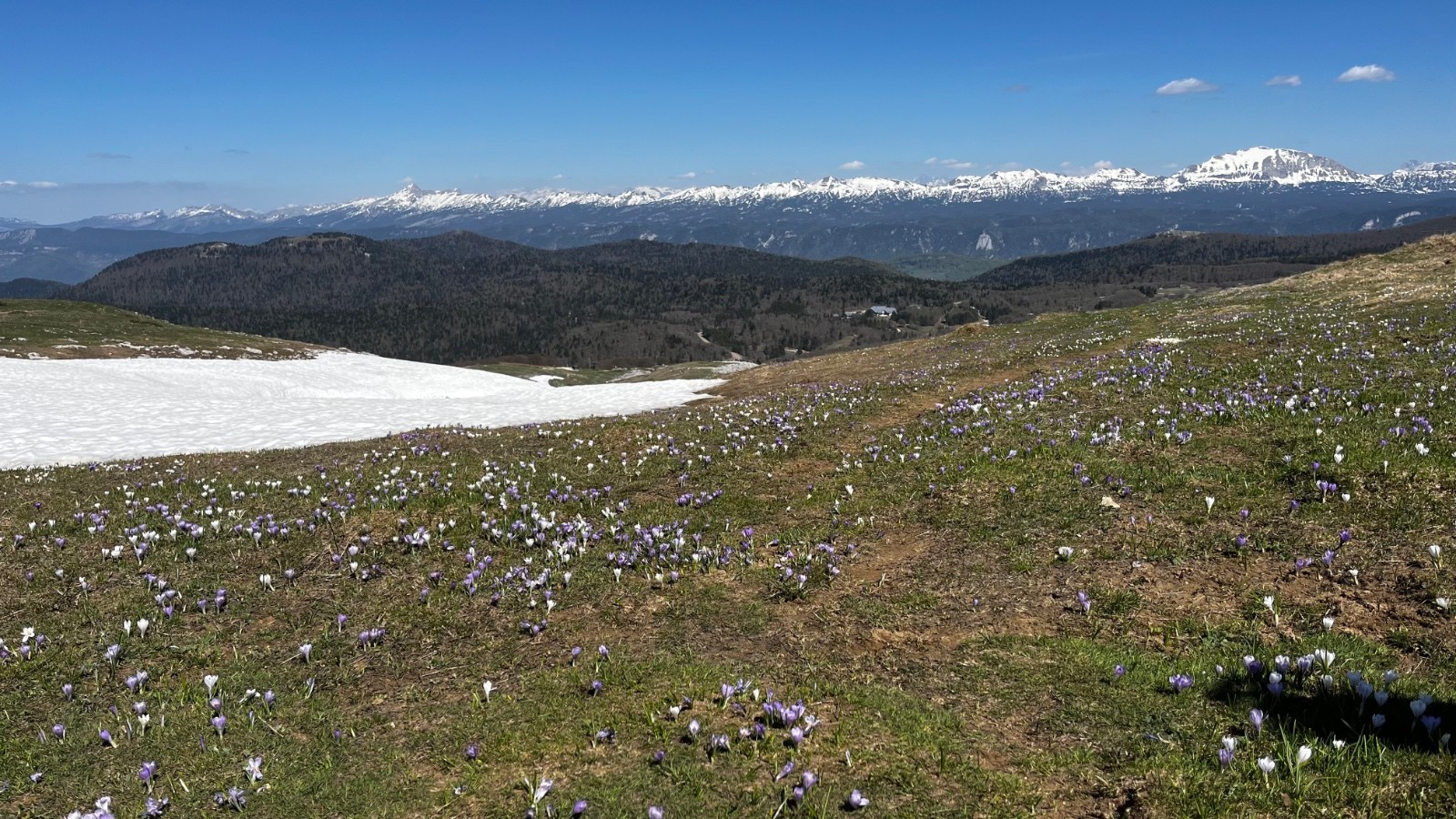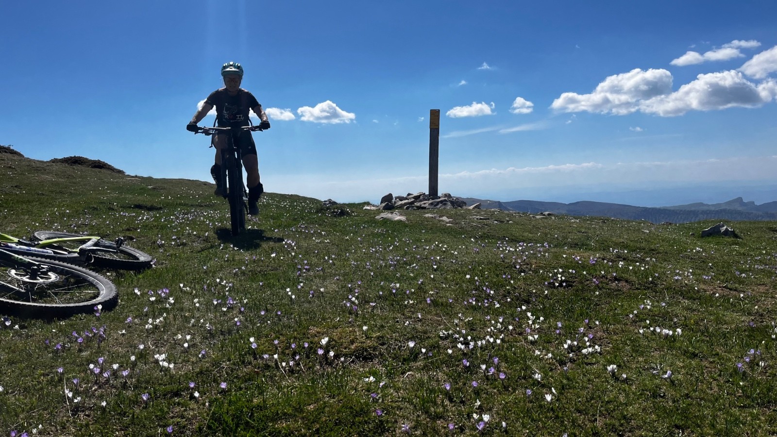 L'essentiel de la montée se fait sur route et piste agréables. Ayant raté la bifurcation du sentier du pas de La Couronne, on poursuit sur la "piste" pleine de pavés, ce qui nous voudra de débusquer un petit troupeau de chamois et d'envoyer valser un dérailleur dans les rayons. Après démontage, on s'aperçoit de notre erreur et revenons sur nos pas pour trouver le départ du sentier qui se révèle être une trace peu parcourue. Dans ces conditions le fiston sans dérailleur préfère redescendre. On casse la croûte et on poursuit chacun de notre côté. La sente est étroite, déversante, plus ou moins fuyante et encombrée par moment par la végétation mais le paysage est magnifique. Quelques aller-retour pour aider ma petite femme qui se trouve encombrée et nous débouchons sur le plateau: c'est toujours magique de grimper entre ces falaises et de se retrouver d'un coup sur ces pleines herbeuses. Le printemps est là, on traverse, entre roulage et poussage, ces étendues toute fleuries, jusqu'à rejoindre la Porte d'Urle qui sera finalement notre choix de descente.