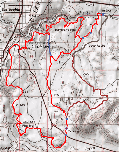 Il y a deux trailheads pour accéder à ce trail system. On peut soit parcourir le JEM trail en aller-retour, soit faire une boucle avec Goulds Rim Trail ou Hurricane Rim Trail (ce qui correspond à la trace GPS)